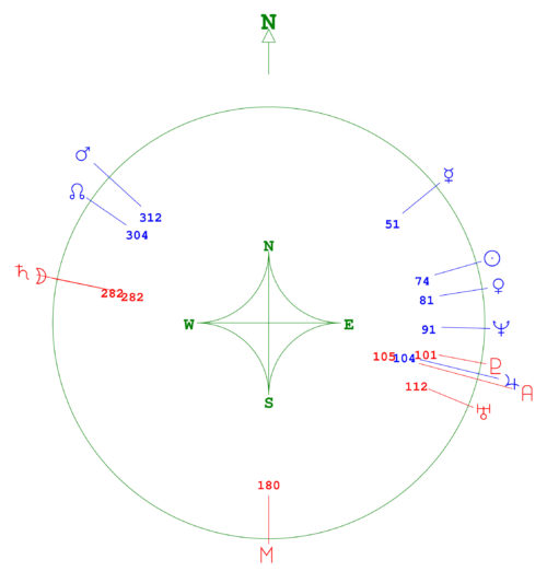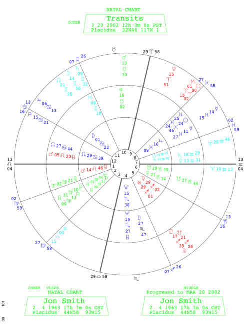 The Composite Chart, devised by Rob Hand, is used for understanding the relationship between two people. The calculations create one chart from the midpoints of the planetary positions of the two charts.The chart uses the latitude of the location of the relationship for all of the house cusps, except the Midheaven. The chart is printed out on the standard one-ring black-and-white chart with midpoint list and aspectarian grid.
