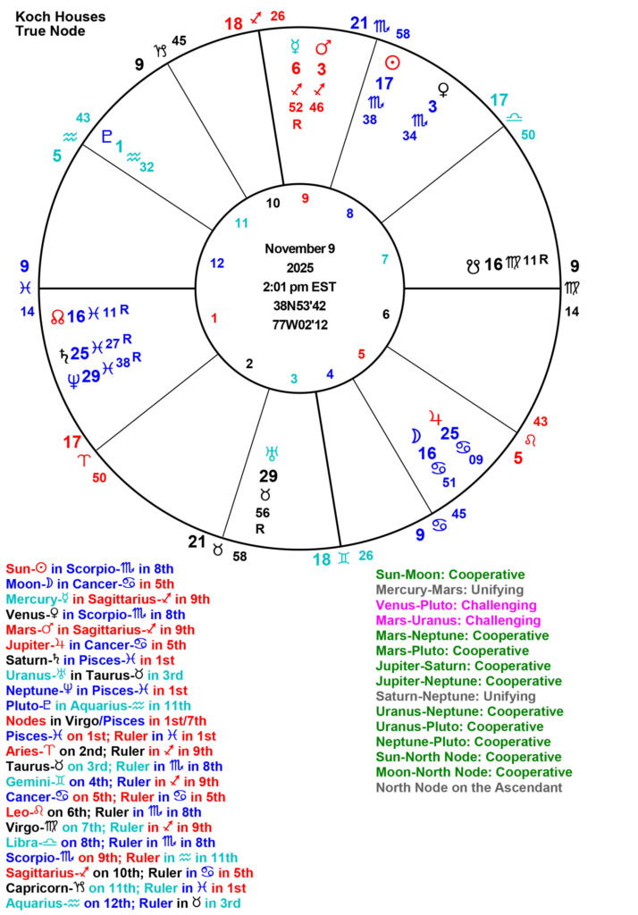 Mars and Mercury Retrograde will be squaring the Ascendant in Pisces, and this could be a time of false statements and masked menaces. There could be more resentment against masked ICE officers, or complaints about the lack of clarity in policy positions. More deceptions may be exposed but without the means to stop the lies. Venus is in a wide trine to the Ascendant, and there could be attempts to put a feel-good facade on events. Venus is also square Pluto, and that could lead to emotional upheaval  and frayed feelings.